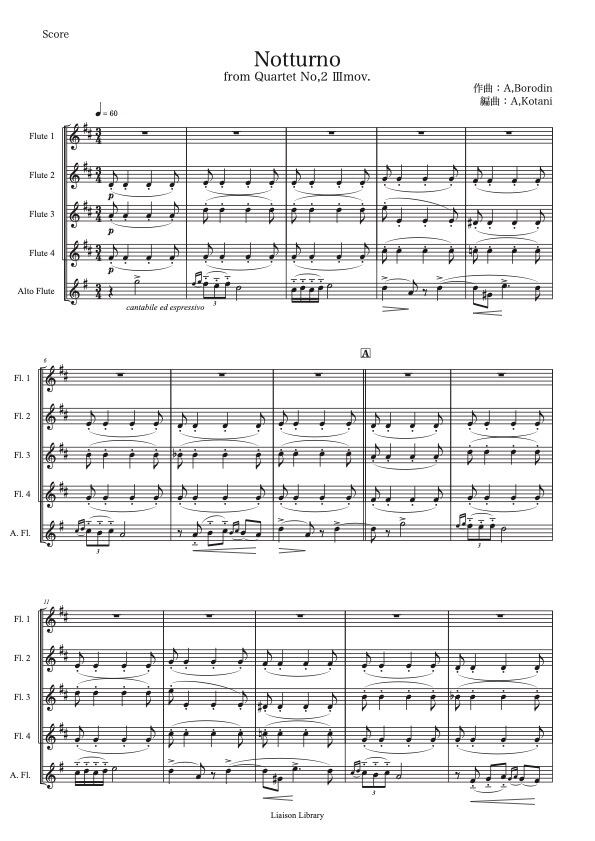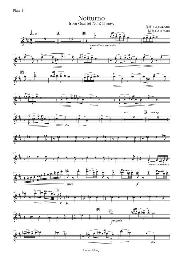 1881年にジトヴォで作曲、翌年初演されたとされるボロディンの弦楽4重奏第2番。この楽曲はボロディンが妻に愛を告白した20周年の記念として献呈された愛の曲です。モーツァルトの室内楽によく見られたように、三部形式とソナタ形式、変奏曲形式が折衷された構成となっています。その中から、美しいメロディーが秀逸な第3楽章をフルートアンサンブル版としました。